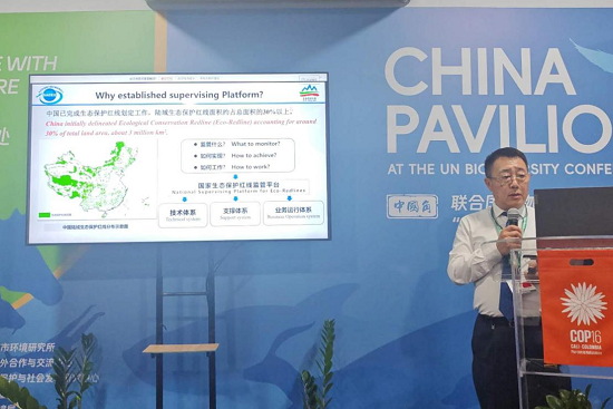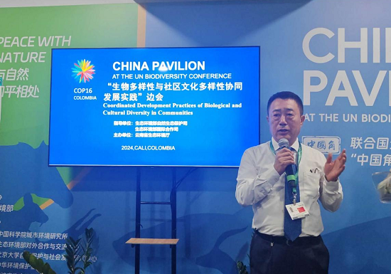 在24日生态环境部对外合作与交流中心主办的“与自然和平相处—中国工商业解决方案暨企业参与生物多样性中国典型案例宣介会”主题边会上,高吉喜首席科学家受邀作主旨发言,介绍了中国生态保护红线的主要划定技术和监管制度,并指出构建一个由政府、企业、个人和社会组织共同参与的生物多样性保护大格局,对于实现可持续发展目标至关重要,希望通过各方的协同合作,发挥各自优势,共同探讨并推动可落地的生物多样性主流化工商业解决方案。
