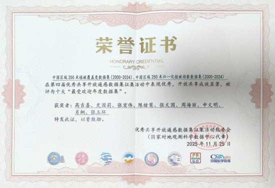 近日,国家对地观测科学数据中心在青岛主办了“2025年空天数据技术与数据治理研讨会”,会上发布了“第四届优秀共享开放遥感数据集”。生态环境部卫星环境应用中心(简称“卫星中心”)高吉喜团队自主研发的“中国区域250米植被覆盖度数据集(2000-2024)、中国区域250米归一化植被指数数据集(2000-2024)”获得“十大最受欢迎年度数据集”。