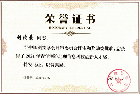 2021年10月18日,中国测绘学会2021学术年会在青岛召开,卫星中心生态部刘晓曼研究员获“2021年青年测绘地理信息科技创新人才奖”称号。