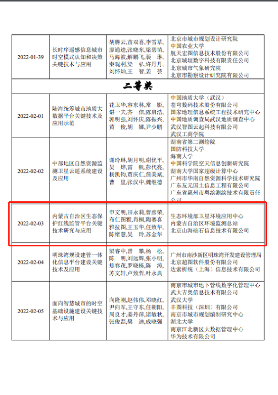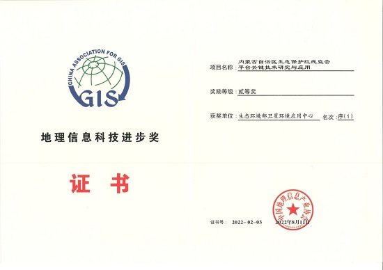 近日,中国地理信息产业协会公布了“2022地理信息科技进步奖”评选结果,卫星环境应用中心牵头、联合内蒙古自治区环境监测总站和北京山海础石信息技术有限公司共同申报的《内蒙古自治区生态保护红线监管平台关键技术研究与应用》项目,荣获2022地理信息科技进步二等奖。