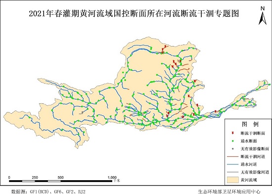 为推动黄河流域水资源保护和高质量发展,卫星中心水生态环境遥感部利用优于2米的高分辨率遥感数据,对2021年春灌期(3-5月)黄河流域国控断面所在河流断流干涸情况进行了遥感监测分析。